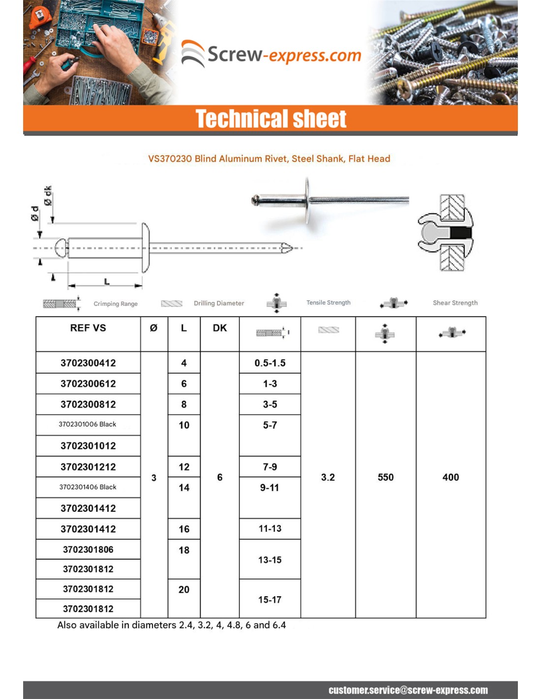 Blind rivets Aluminium Stahlgewinde 4X20 Thickness Of Panel 14 to 16 Flat Head ALX