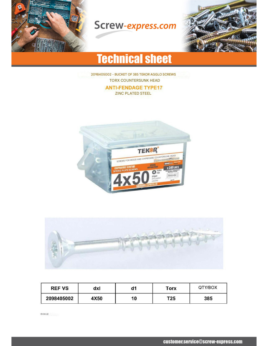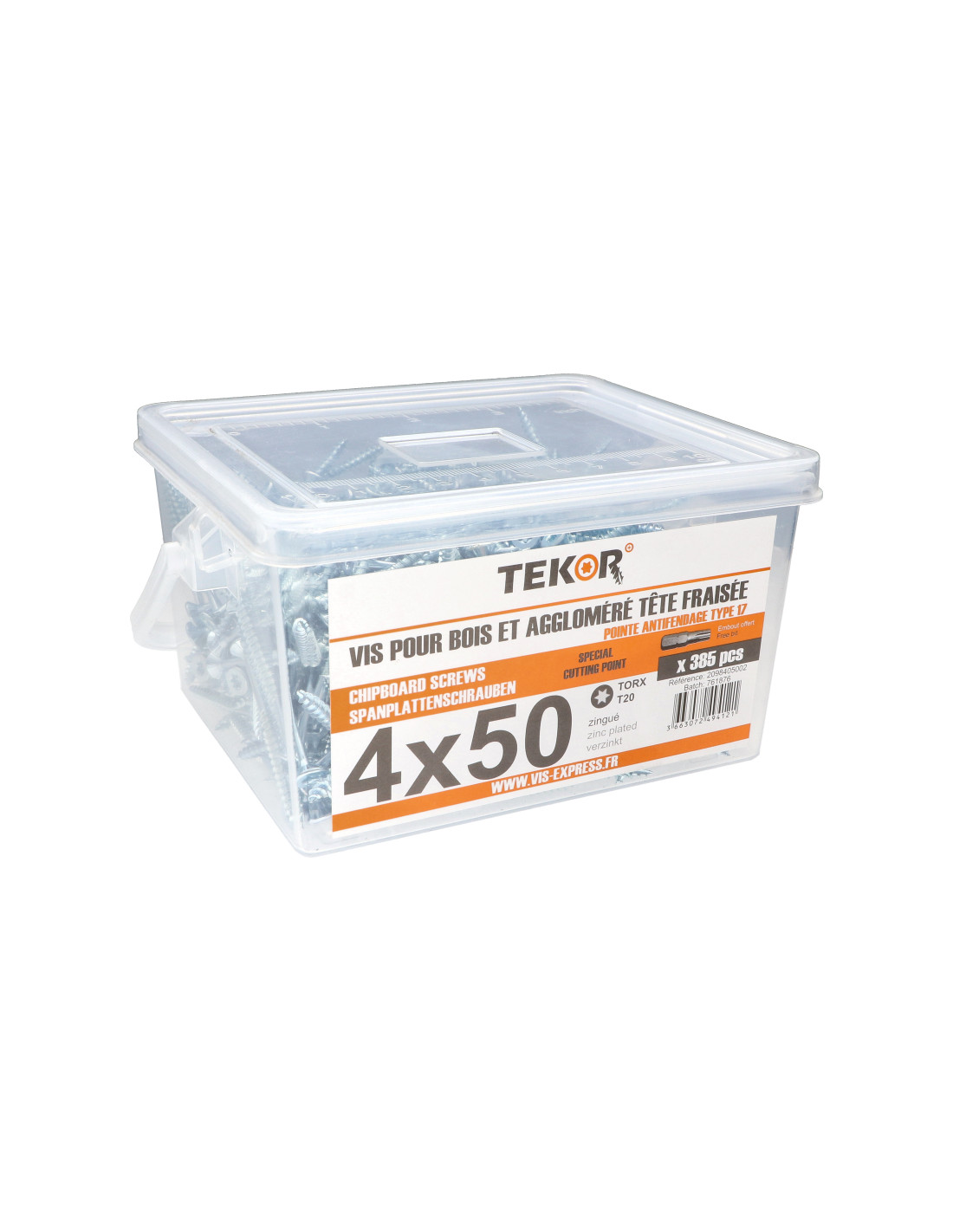 1 x Bucket of 385 Chipboard Screw Tekor 4X50 Countersunk Head T20 cut Type 17 Drilling Point Zinc Plated