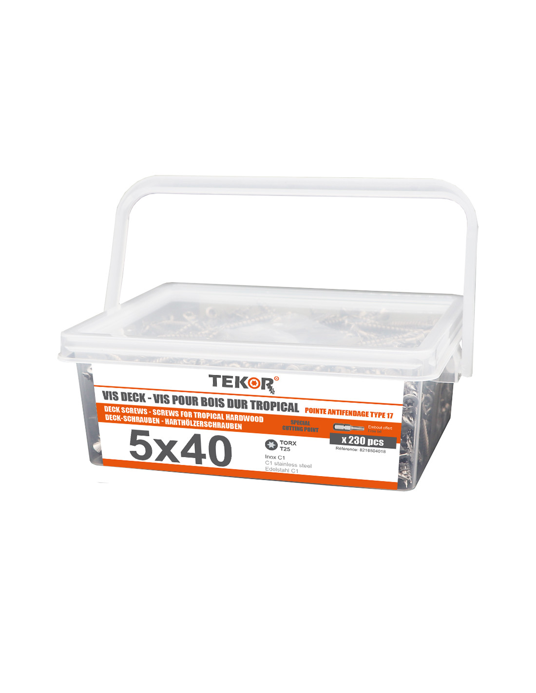 1 x Bucket of 230 Decking Screw TEKOR 5X40 cut Type 17 Drilling Point Stainless Steel C1 AISI 410 Countersunk Head T25
