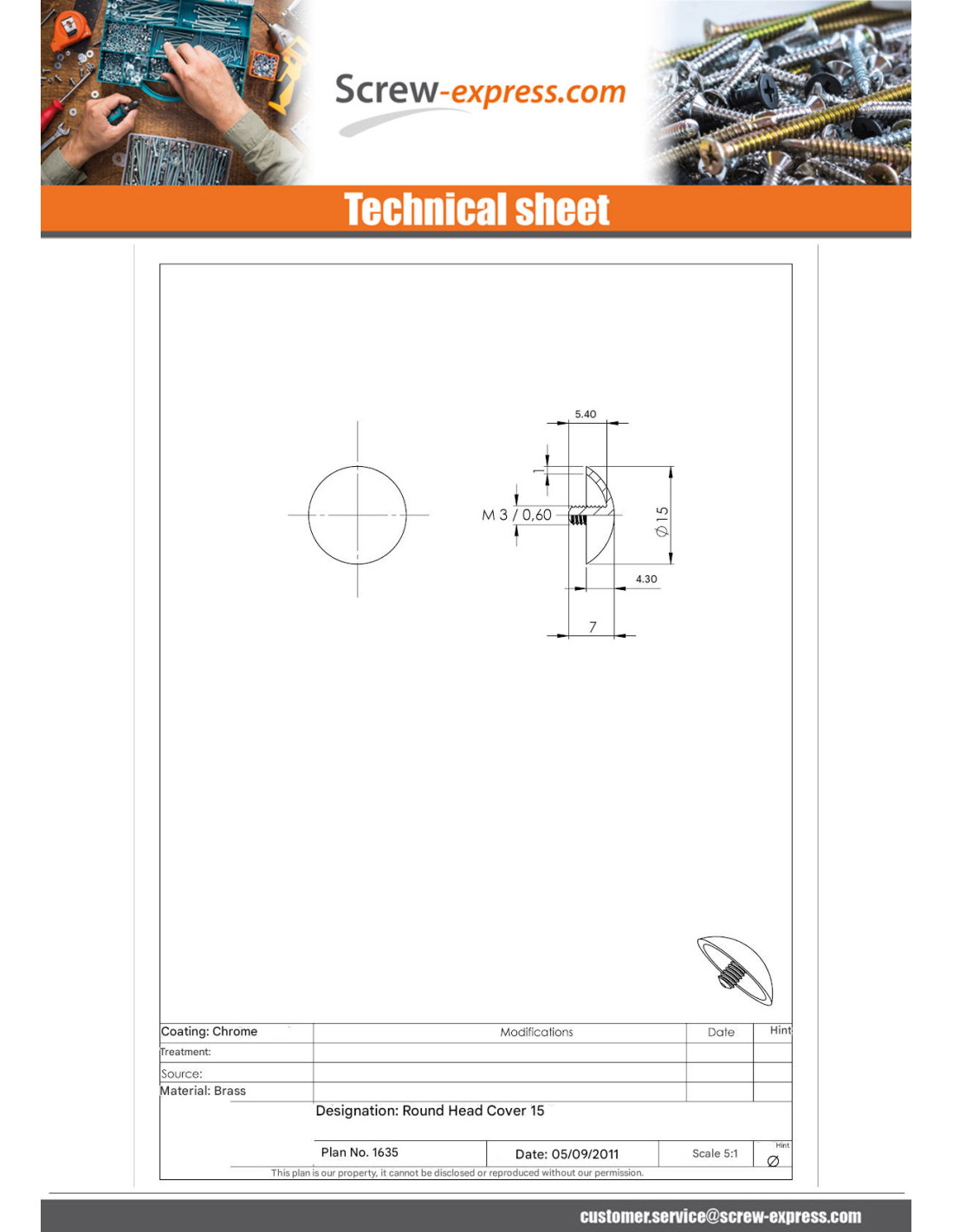 1 x Cap ROUND. Brass Diameter 15 STEM M3X5.4
