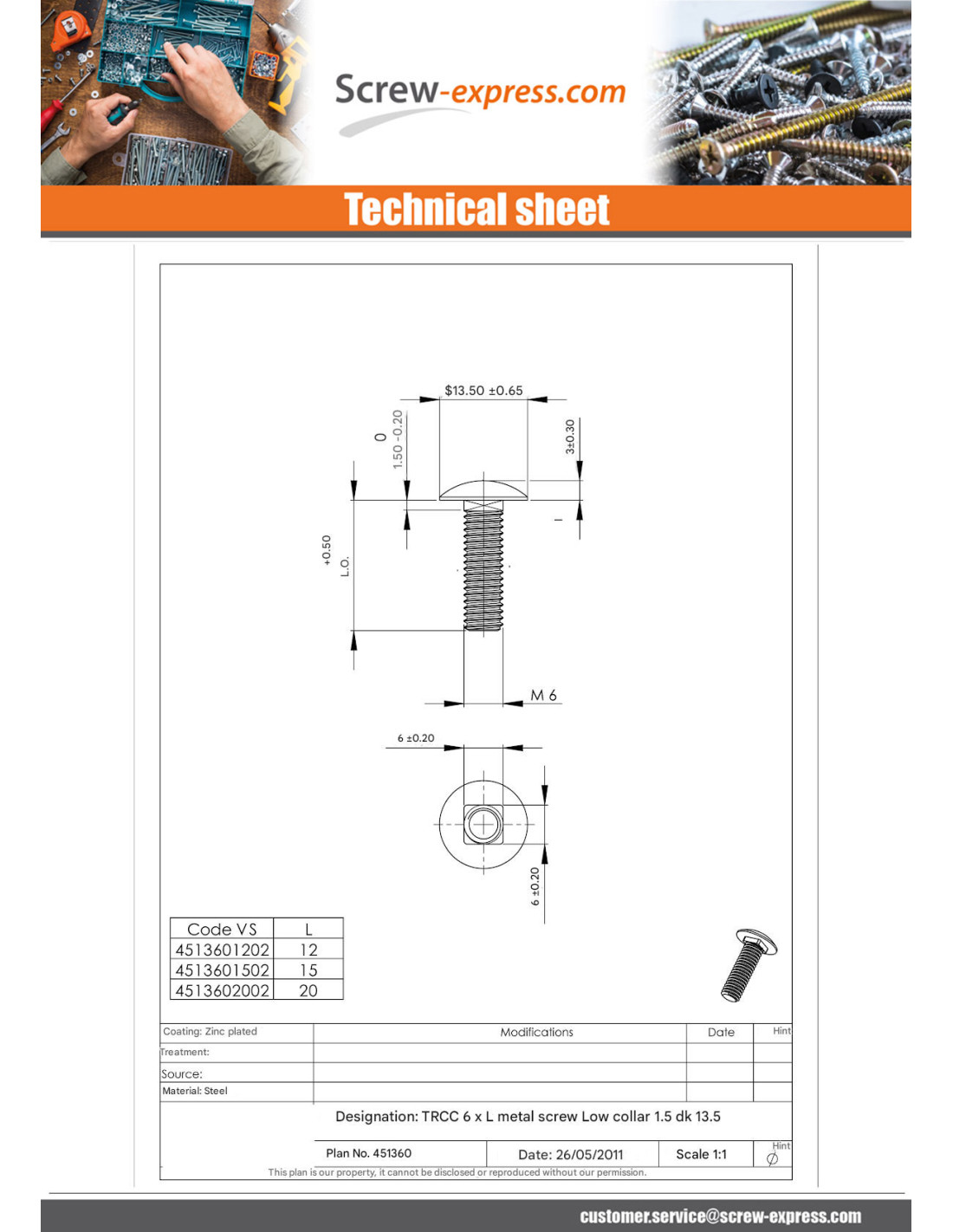 1 x Carriage Bolt M6X20 Thin Square 1.5 Head Diameter: 13.5 Class 8.8 Zinc Plated