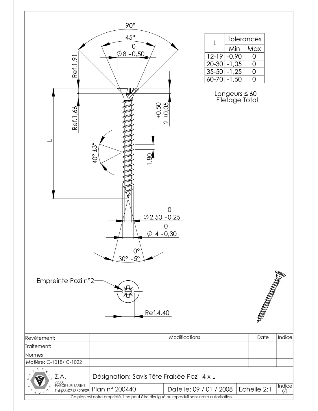 Chipboard Screw Countersunk Head Pozi N°2 4.5X23 Full Thread Zinc Plated