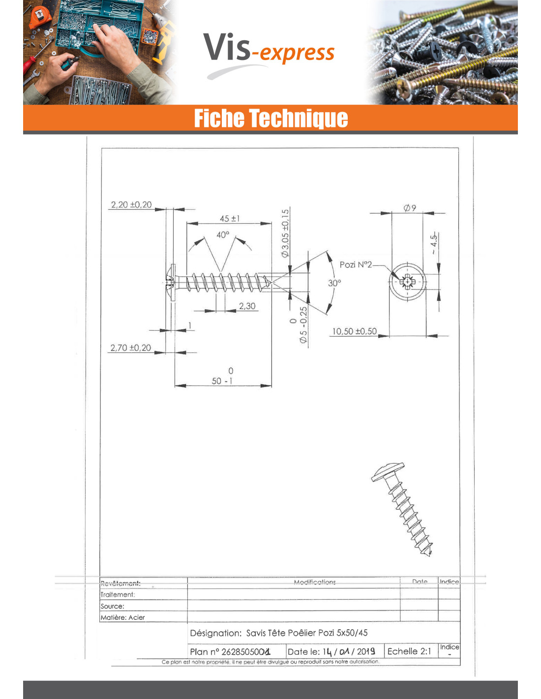 Chipboard Screw Mushroom Pozi N°2 5X50 Thread Length: 45 Steel Other Reference : 3617500719270 3663072259133