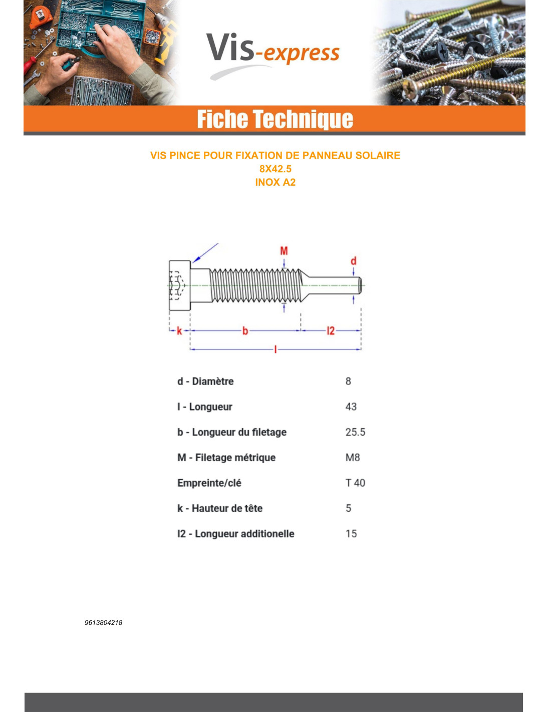 Screw PLIERS SOLAR M8X43 Stainless Steel A2 Other Reference : 0ZPVKBA000080 5410439162029