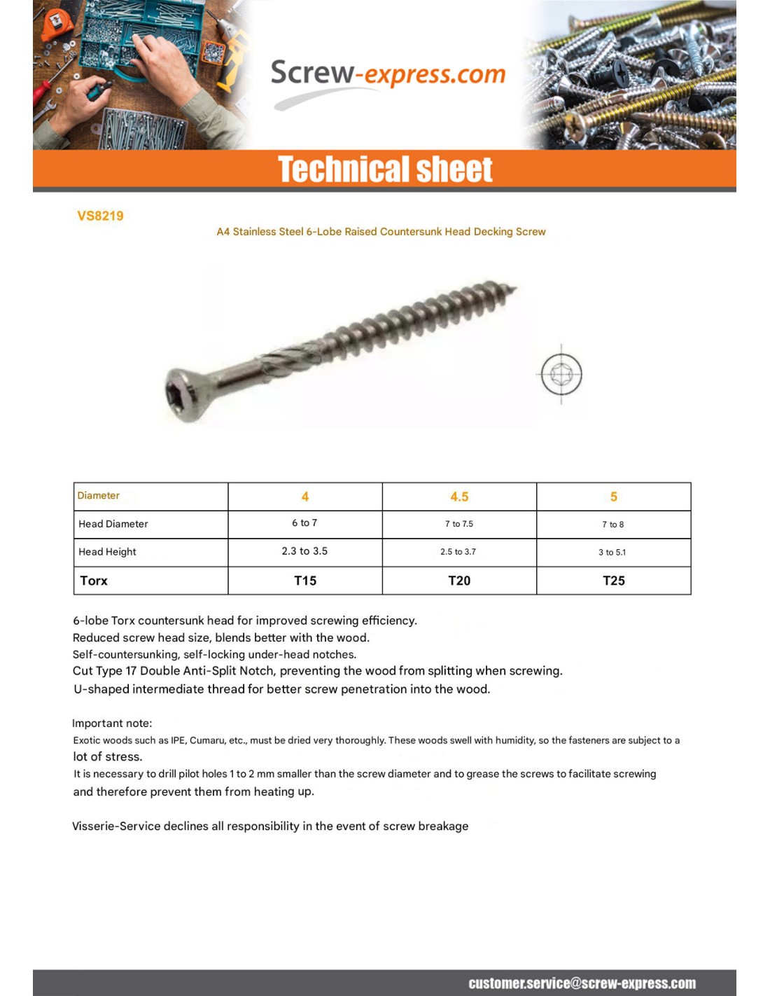 I use these screws to hold the slats of my terrace For this I use TFB Torx T25 5x60 screws in A4 stainless steel.