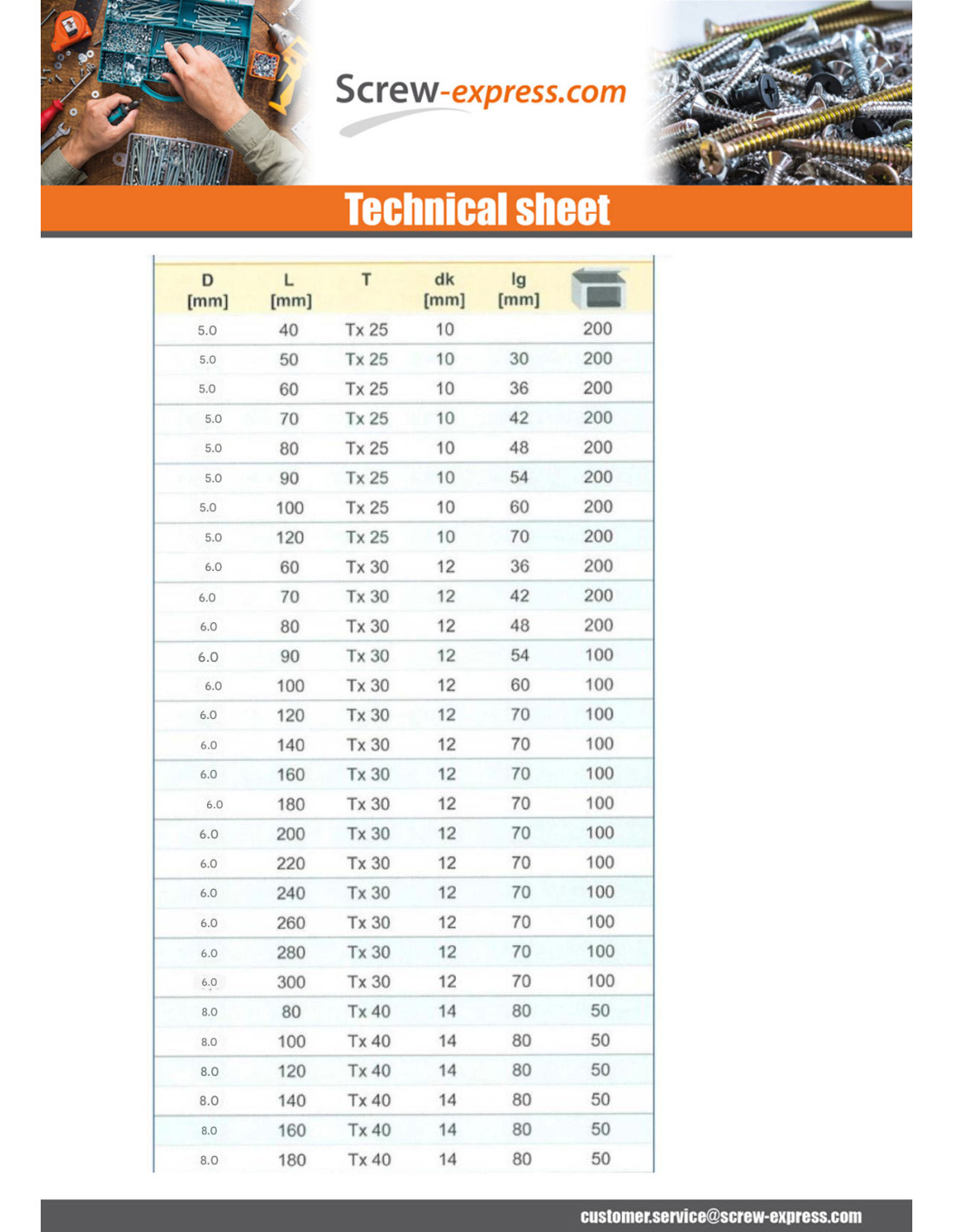 Construction of a wooden shelter Framing screw Countersunk head TF Crant TORX T30 6X140 Thread on 70 Anti-splitting tip cut type 17 Steel Packaging: 100 pieces