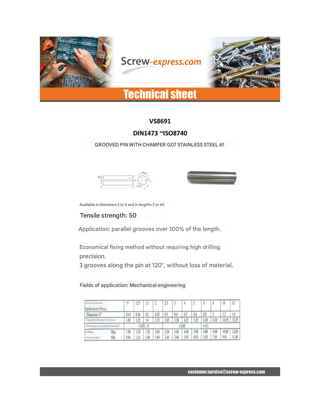 GROOVED PINS FULL LENGTH PARALLEL GROOVED CHAMFER G07 STAINLESS STEEL A1 DIN 1473