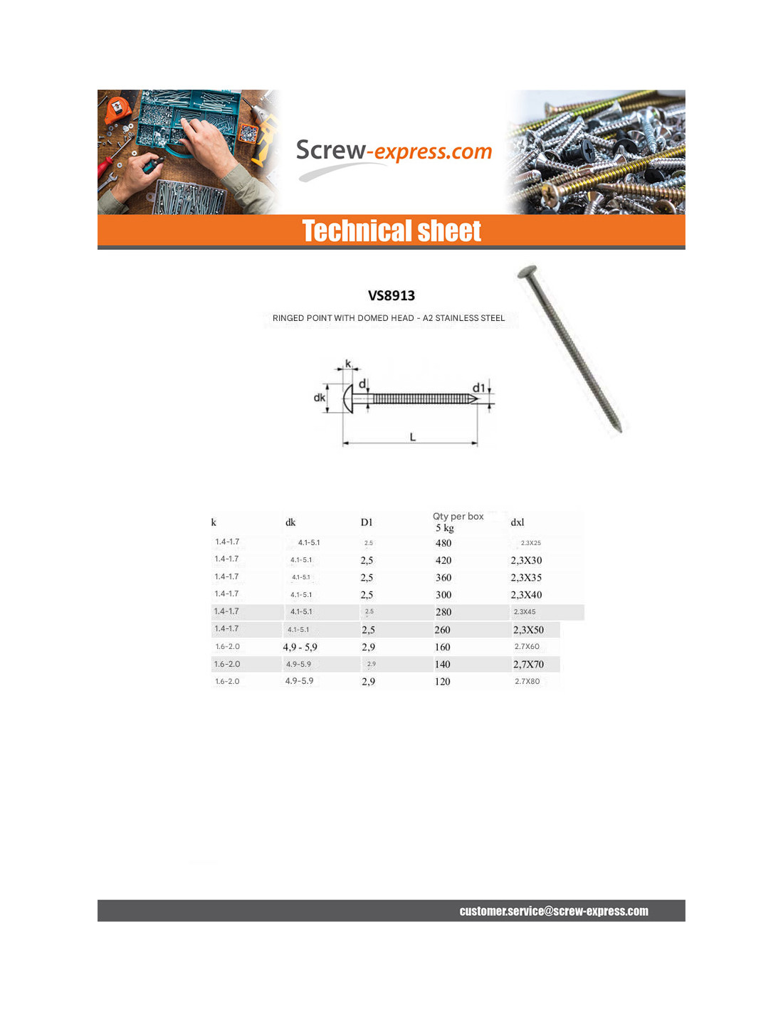 1 x Kg of nails Stainless Steel A2 Round Head RINGED 2.7X60