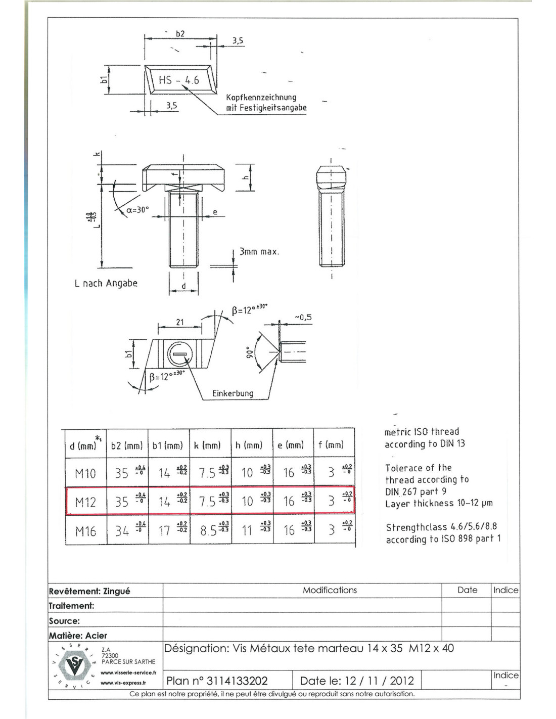 Machine Screw Hammer Head M12/30 12X34 Class 6.8 Zinc Plated