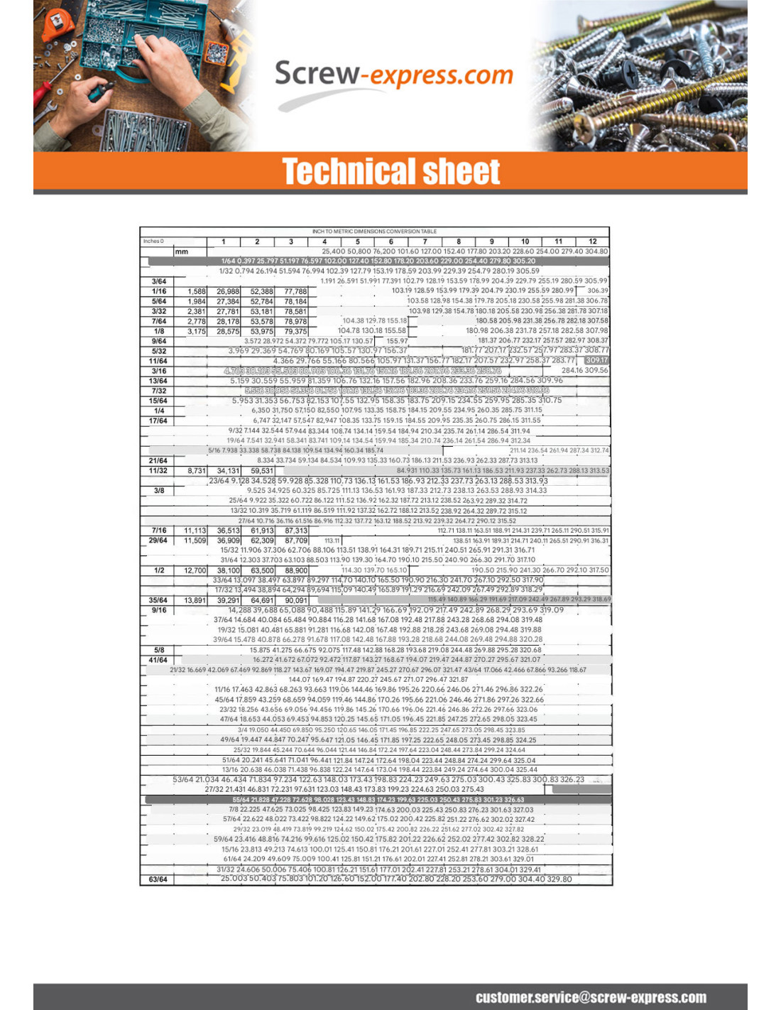 Correspondence table inches and mm