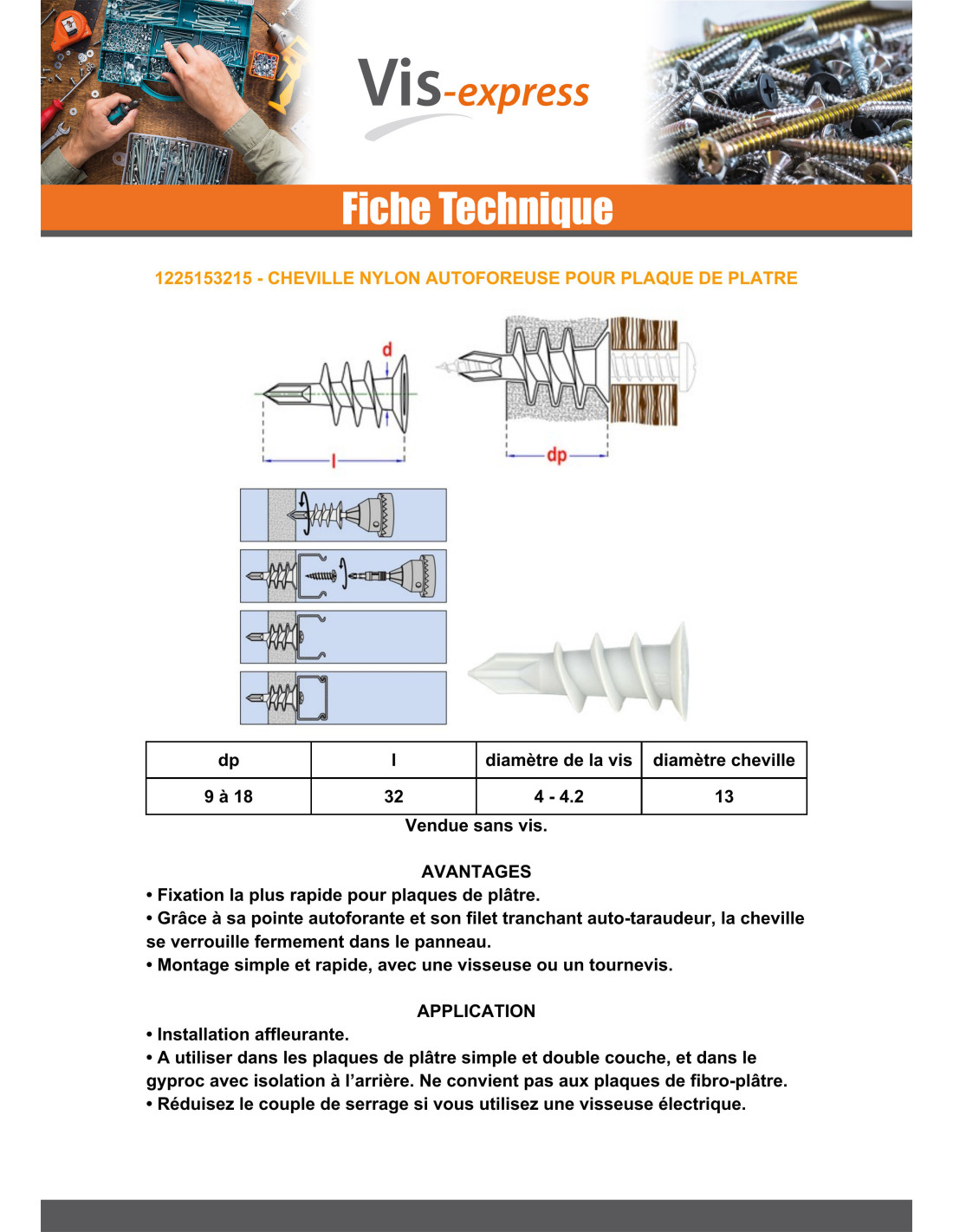 Plug Nylon SELF-DRILLING PLATE PLASTER 15X32 Other Reference : 3663072494206