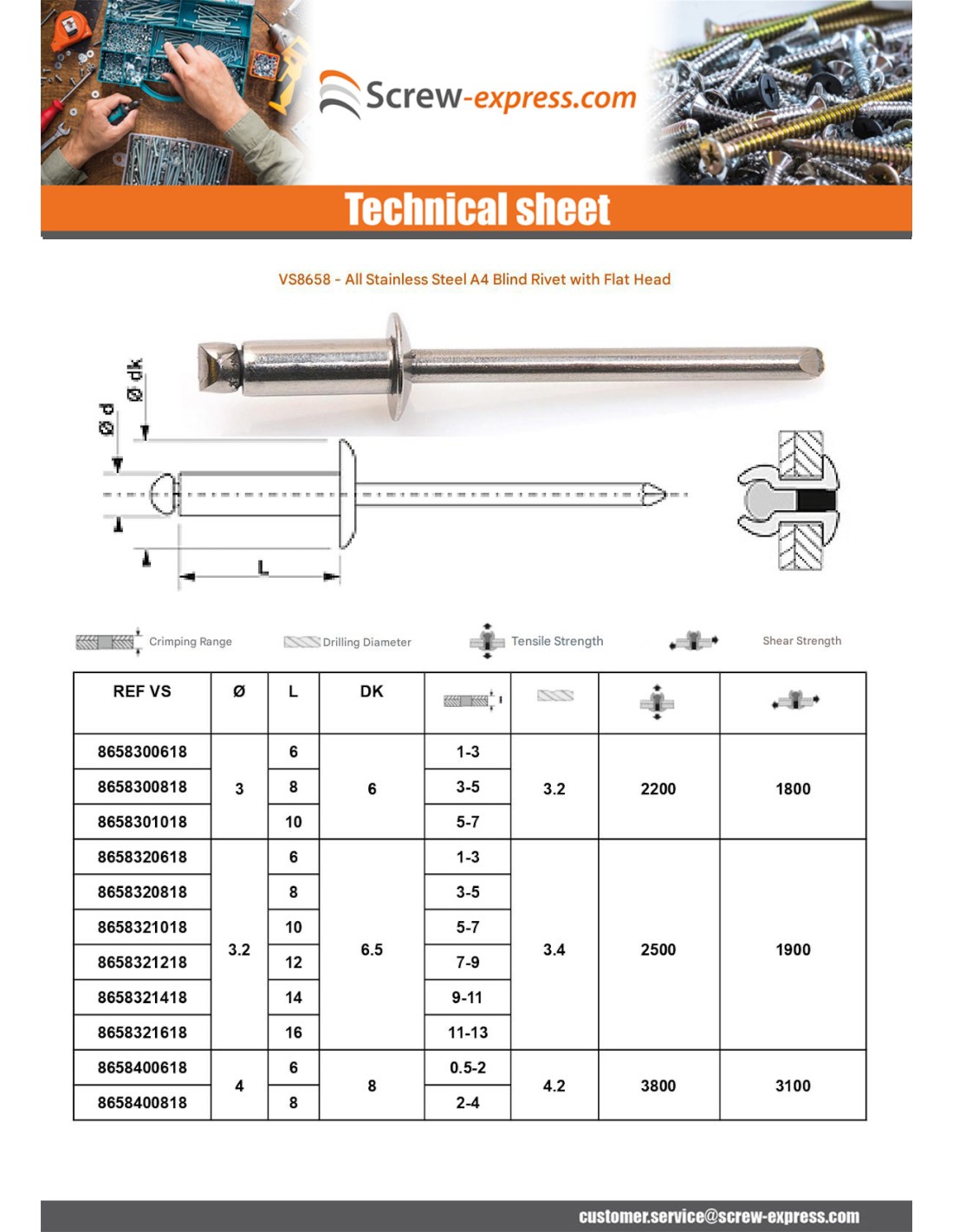 Rivet Blind STANDARD Entirely Stainless Steel A4 Flat Head DOC 3702