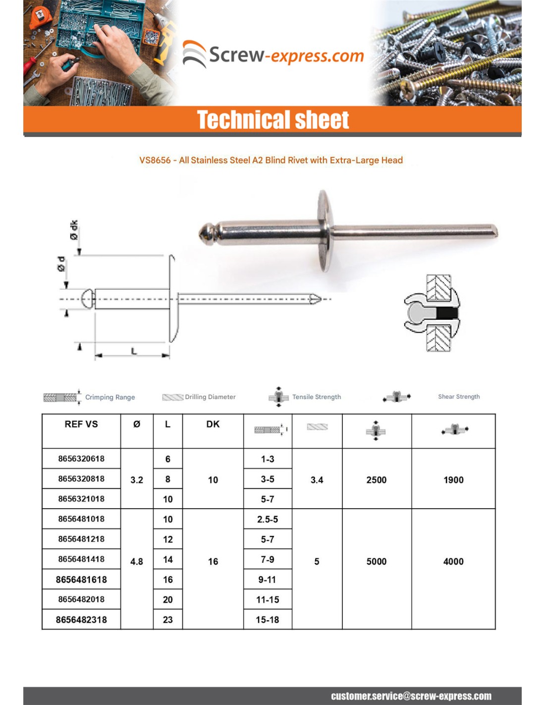 Rivet Blind All Stainless Steel Extra Large Head 3.2X8 Thickness Of Panel 3 to 5