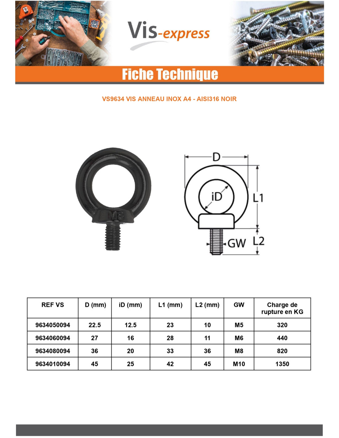 Diameter = M10, Length = 45, Coating = Stainless Steel A4 Black, Material = Stainless Steel A4, Norm = VS-DIN580, Product Family = Ring