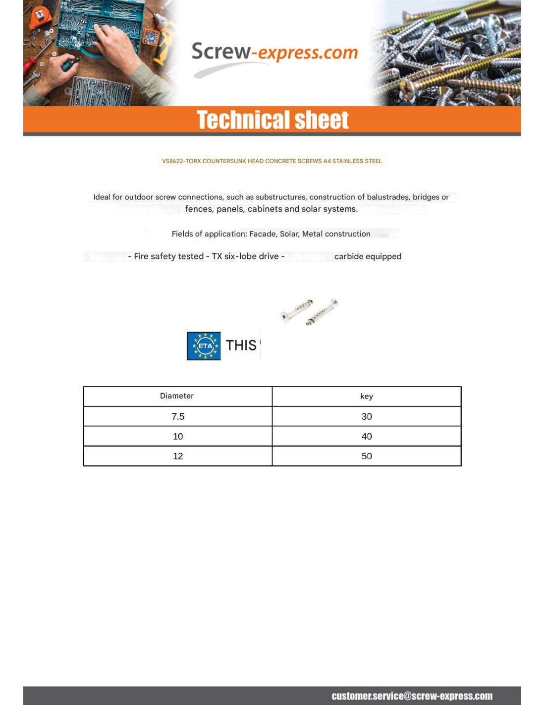 1 x Screw For Concrete Countersunk Head T30 Stainless Steel A4 7.5X85 Thread Length: 30