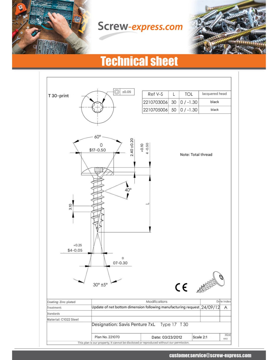 Screw for metal shoe 7/30 hinge screw. T30
