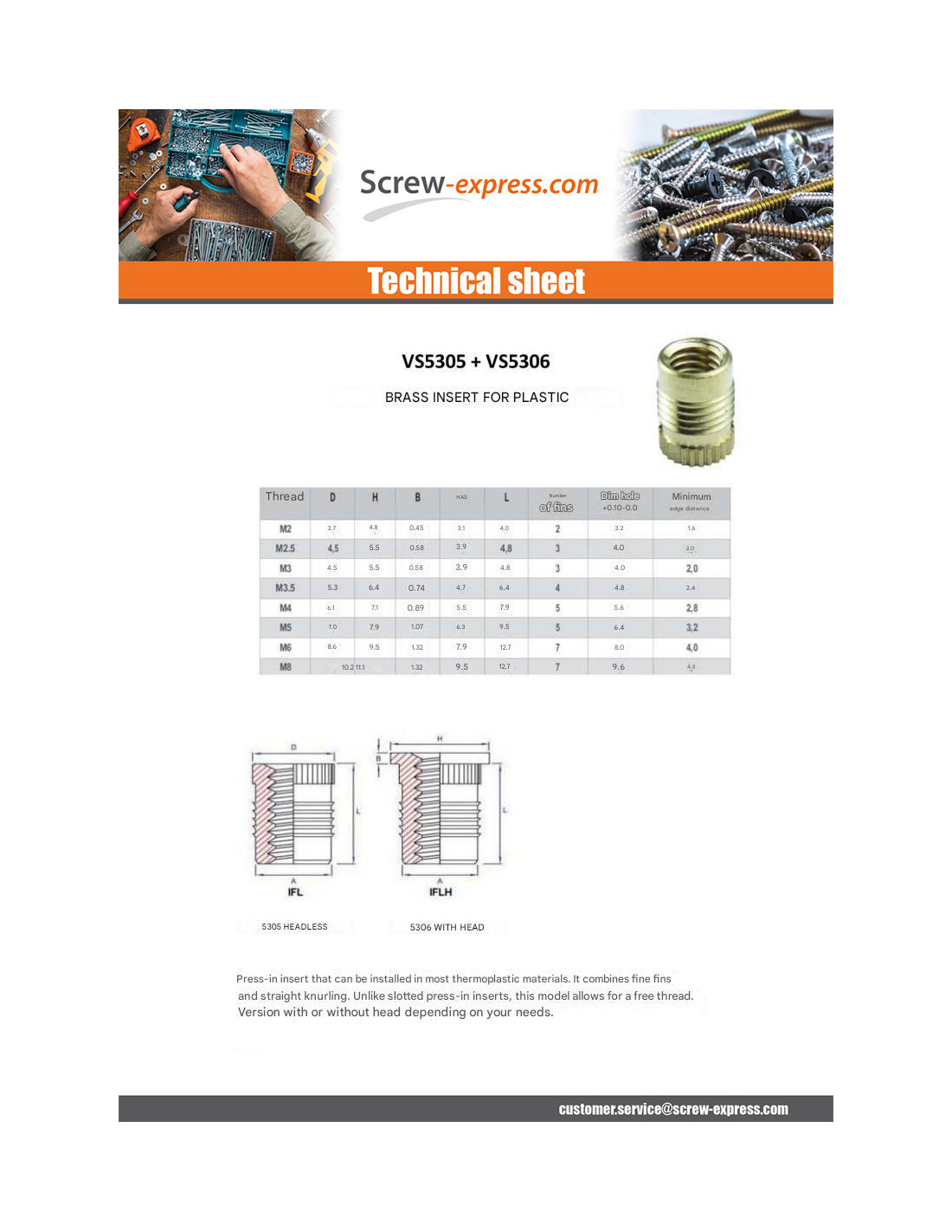 Self Tapping Insert Set Screw FINFIX Brass M3X4.8 Other Reference : 3663072432192