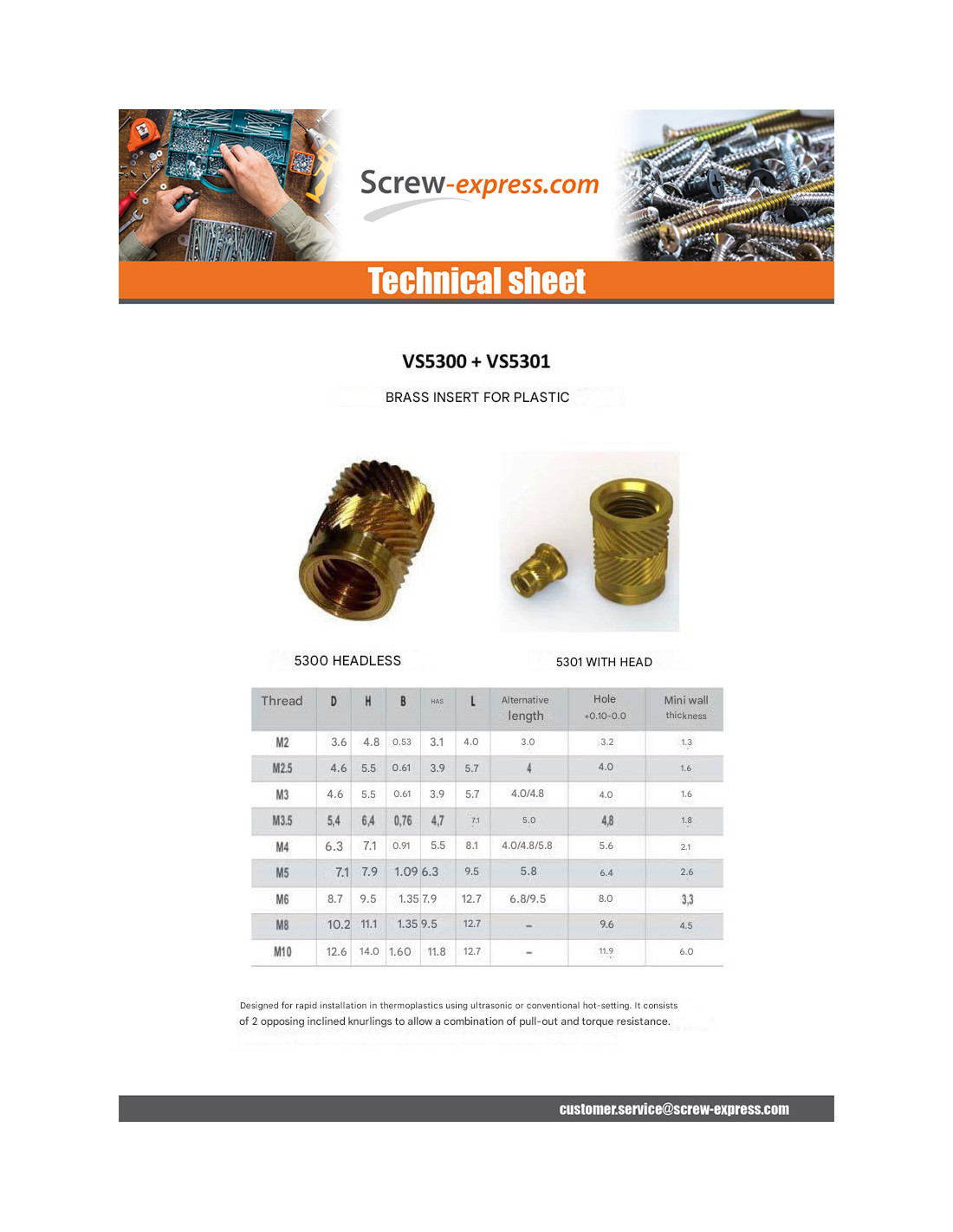 SELF TAPPING INSERT SET SCREW SONICFIX BRASS