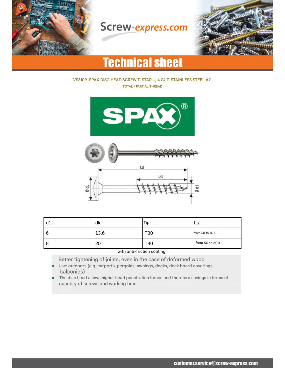 Spax Carpenter Screw Disc Head Stainless Steel A2 6X60 Full Thread T30