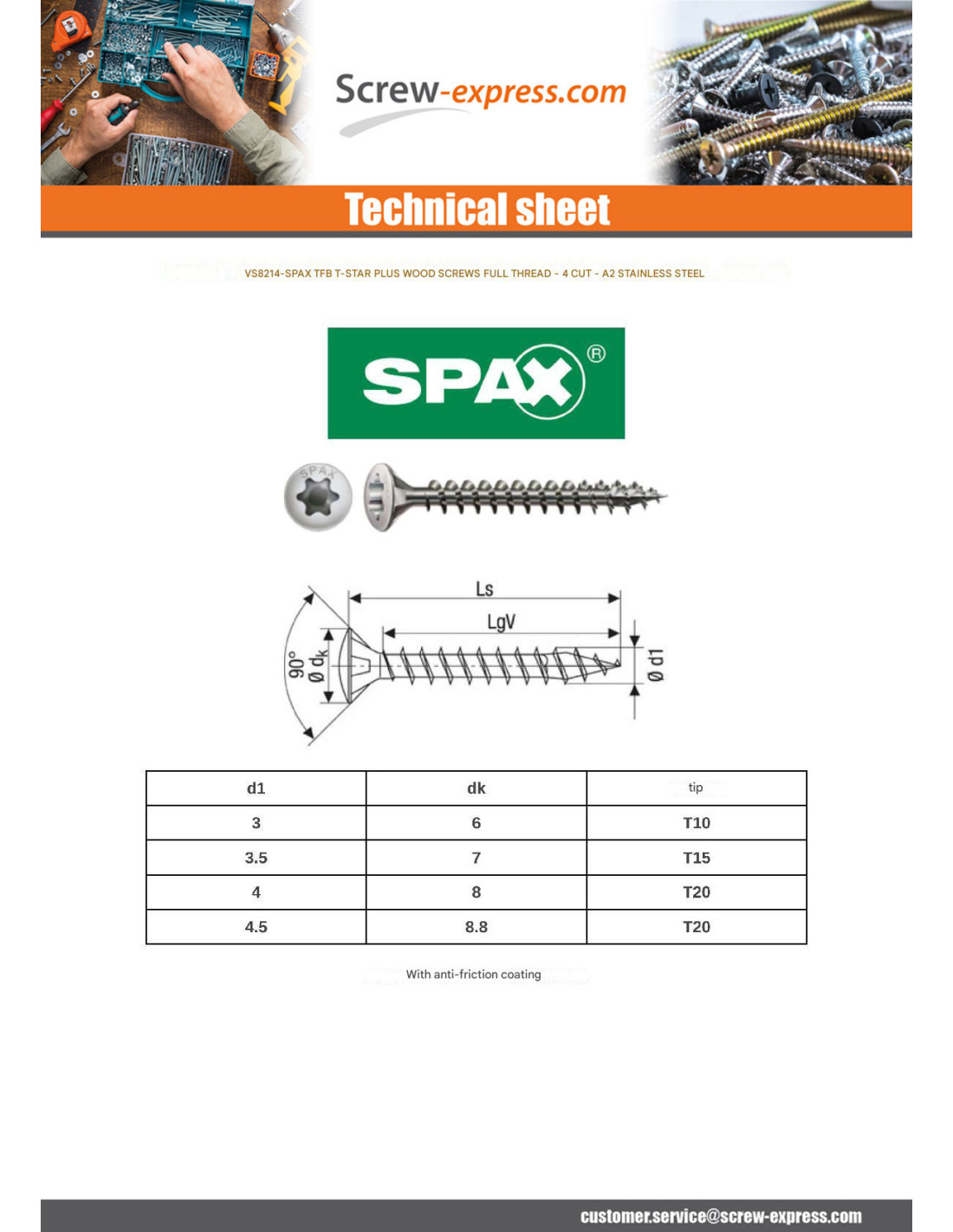 SPAX WOOD SCREW PAN COUNTERSUNK HEAD T-STAR TORX FULL THREAD STAINLESS STEEL A2