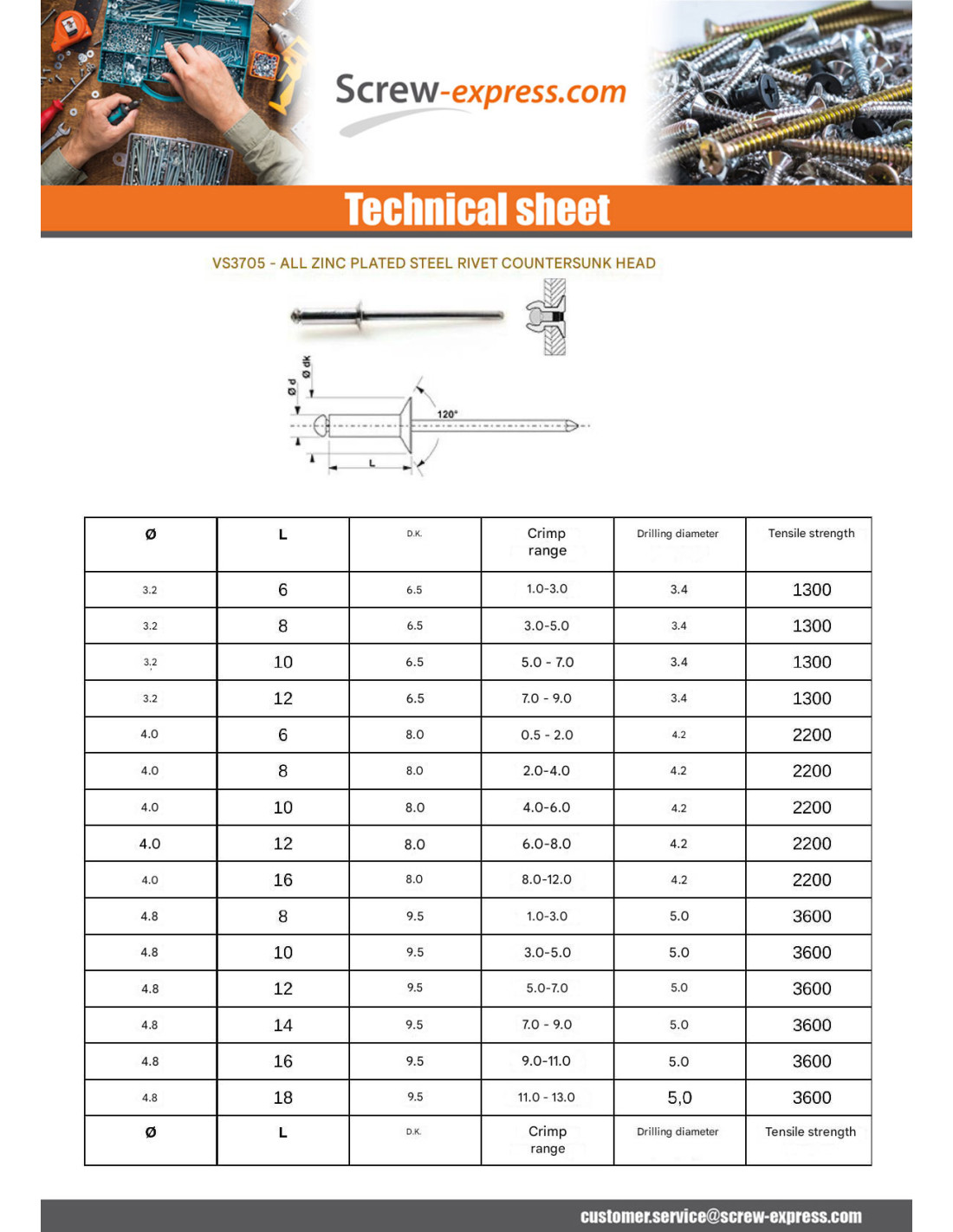 Rivet Steel/ steel ZING 4X8 Thickness Of Panel 2 to 4 Countersunk Head