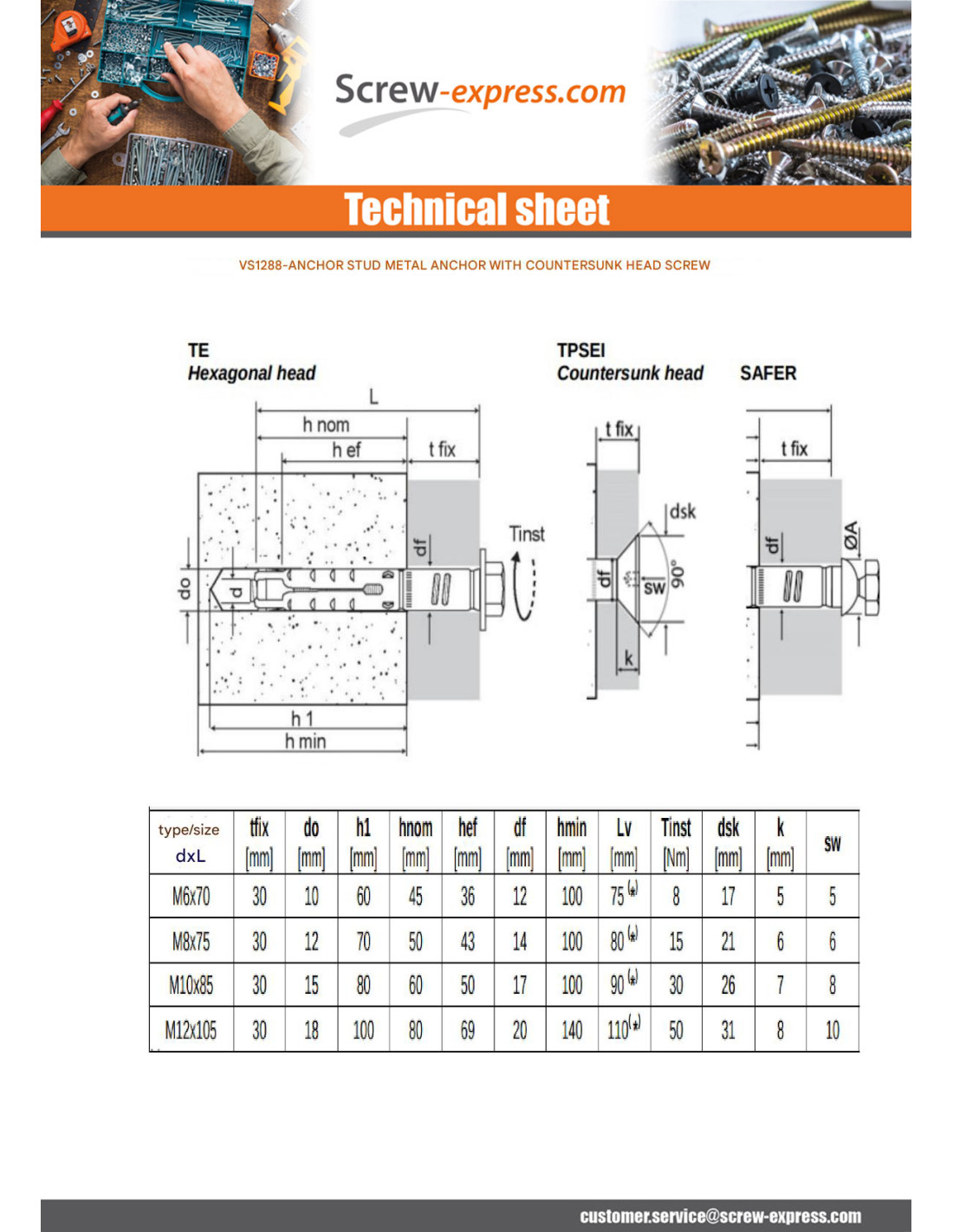 1 x Stud Anchor Plug METAL 10X70 Screw M6X75...