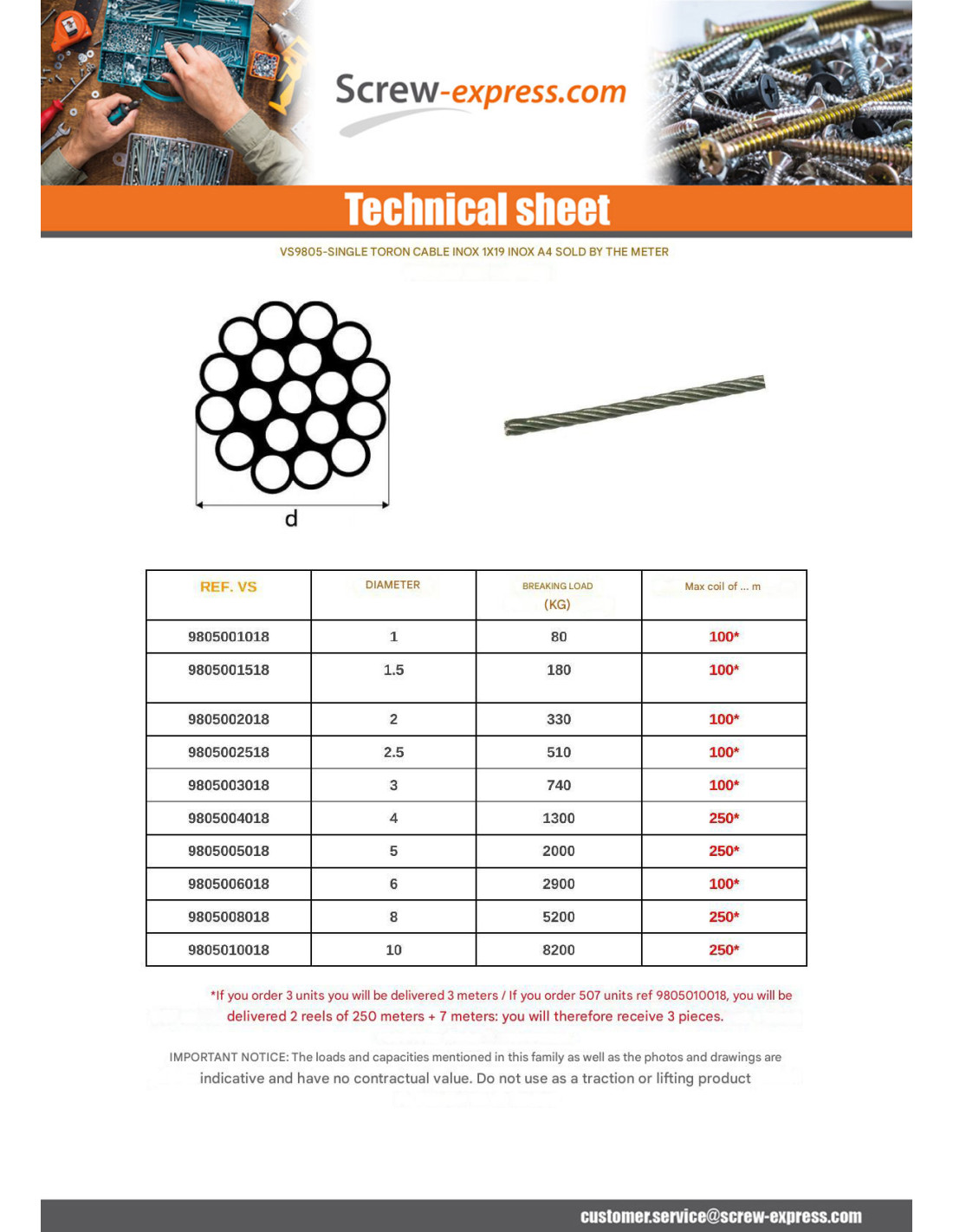 Meter of Wire Rope Diameter 8 Stainless Steel A4 1X19 (Sold By Meter)